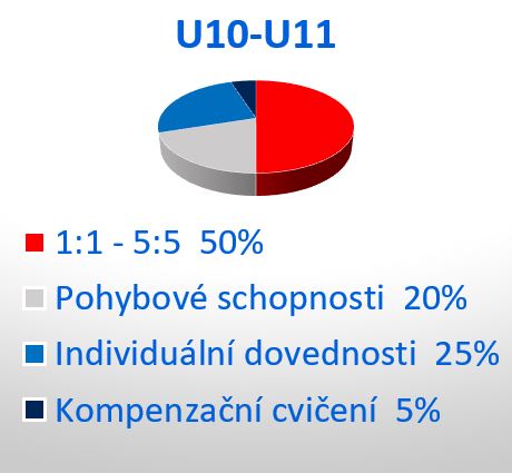 Vzhledem k rozdílnosti obou ročníků tentokrát rozdělím obě kategorie a popíšu je zvlášť. Kategorie U10 je přechodem do širšího vnímání skupiny. Na hřišti se zvětšuje počet hráčů, zvětšuje se hřiště, a to klade obecně větší nároky. Zde je vhodné, aby byla nastavena a dodržována pravidla a v rámci pravidel, aby se učily nést odpovědnost za svá rozhodnutí. Akce a reakce je důležitá k uvědomění, které se zvětšuje v této kategorii. V této kategorii však můžou být i jedinci, kteří jsou vývojově o trochu pomalu a těm je potřeba vytvořit ještě více prostředí spadající spíše do kategorie předchozí. Byť se tělem mohou zdát velcí, tělo v rámci vývoje je vždy napřed před myslí (např. v 18 letech můžeme mít dospělé tělo, ale dospívající mysl), a tak není třeba se nikam hnát, mysl jednou tělo dojde. Takovým hráčům je kolikrát vhodnější domluvit přáteláky 4+1, protože jdeme stále více po rozvoji individuality, po dotecích s míčem. Časoprostorový tlak může být ještě příliš velký.