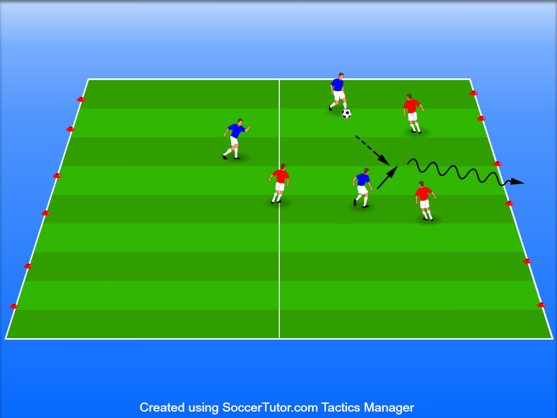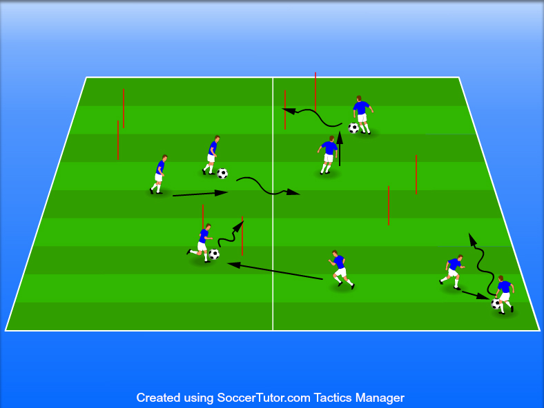 Hráči s míčem získávají bod za provedení míče skrze branku z tyčí. Hráči bez míče se snaží konstruktivně získat míč, v případě zisku provádějí míč skrze branku. Za provedení hráči získávají bod, cvičení probíhá soutěžní formou. Hráči nejsou rozděleni do dvojic, jsou rozřazeni na začátku cvičení půl hráčů s míčem, půl bez. Může tedy docházet k variantě, kdy není hráč s míčem napadán a naopak kdy se jiný hráč s míčem dostane do podčíslení (např. 1vs2, 1vs3).