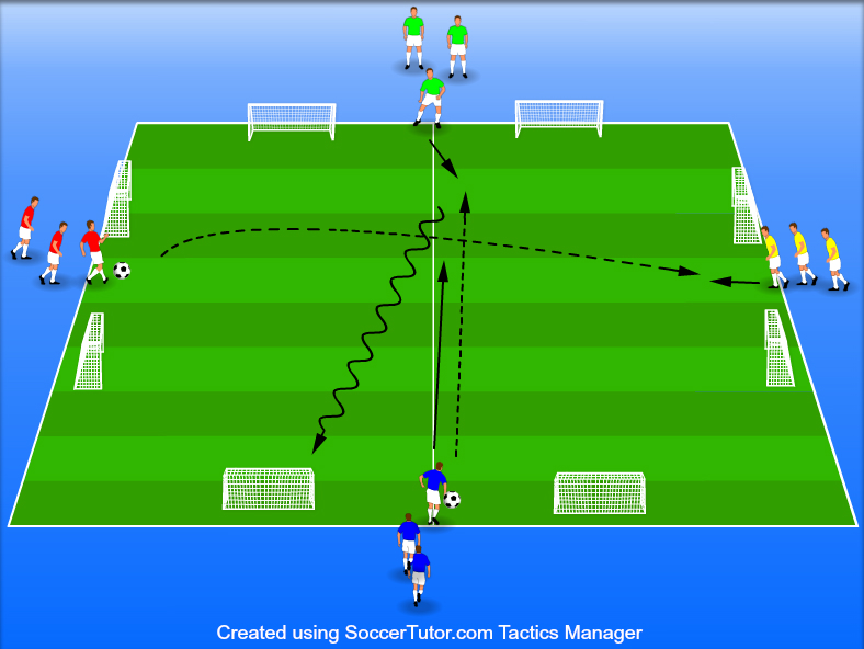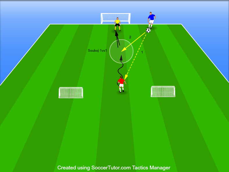 Dvě skupiny po šesti rozdělené na dvě trojice hrají na dvou hřištích souboj 1vs1. Hřiště se prolínají. Na každém hřišti se útočí na dvě branky. Startuje tým modrých přihrávkou na zeleného hráče, který zahajuje cvičení vyběhnutím. Probíhá souboj 1vs1. Mezitím už může začít souboj z druhé strany, kdy červený hráč nahrává žlutému. Hraje se do zakončí, při ztrátě/zisku míče následuje přepnutí.