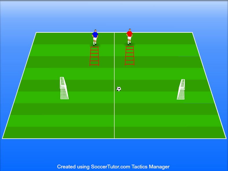Hráči na pokyn trenéra startují, přebíhají koordinační žebřík a provádějí souboj 1vs1 se zakončením do otočených branek. Po zakončení vybíhá další dvojice.