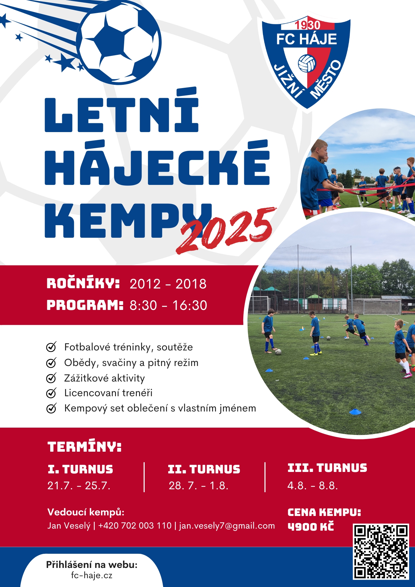 Jako každý rok, i letos pořádá FC Háje JM fotbalové kempy pro děti. Program bude bohatý! Novinkou letošního turnusu je kempové oblečení s vlastním jménem! Přihlas se ještě dnes na odkazu níže!