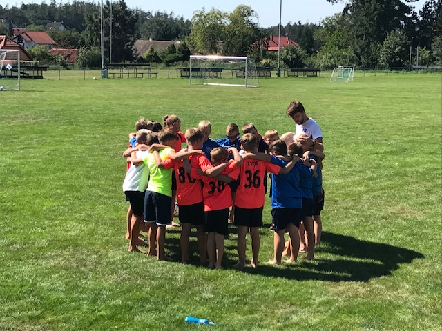 Dopolední trénink byl rozdělen na dvě části, před svačinou se trénovalo formou her s míčem s důrazem na vzájemné seznámení. Po dopolední svačince děti trénovaly střelbu na bránu. Po obědě jsem oba dny nechali naše fotbalisty odpočinout u pohádky (Mimi šéf a Zootropolis), následoval odpolední trénink, při kterém se především hrál fotbal. Ve středu jsme trénování mezi pátou a šestou hodinou zakončili fotbálkem v písku. Děti se pak osprchovaly pod venkovní sprchou, dostaly první večeři a okolo půl osmé jsme zapalovali oheň a pekli buřtíky. Mezitím běhali malí fotbalisté po hřišti a okolo půl desáté jsme je zahnali do stanů, kde ale minimálně další hodinku povídaly a povídaly. Budíček jsme neměli, všichni vylezli ze stanů okolo osmé hodiny a po snídani se jelo podle stejného harmonogramu jako ve středu. Těsně po ukončení kempu ve čtvrtek začalo pršet, jsem vděčná za počasí během středy a čtvrtka.
