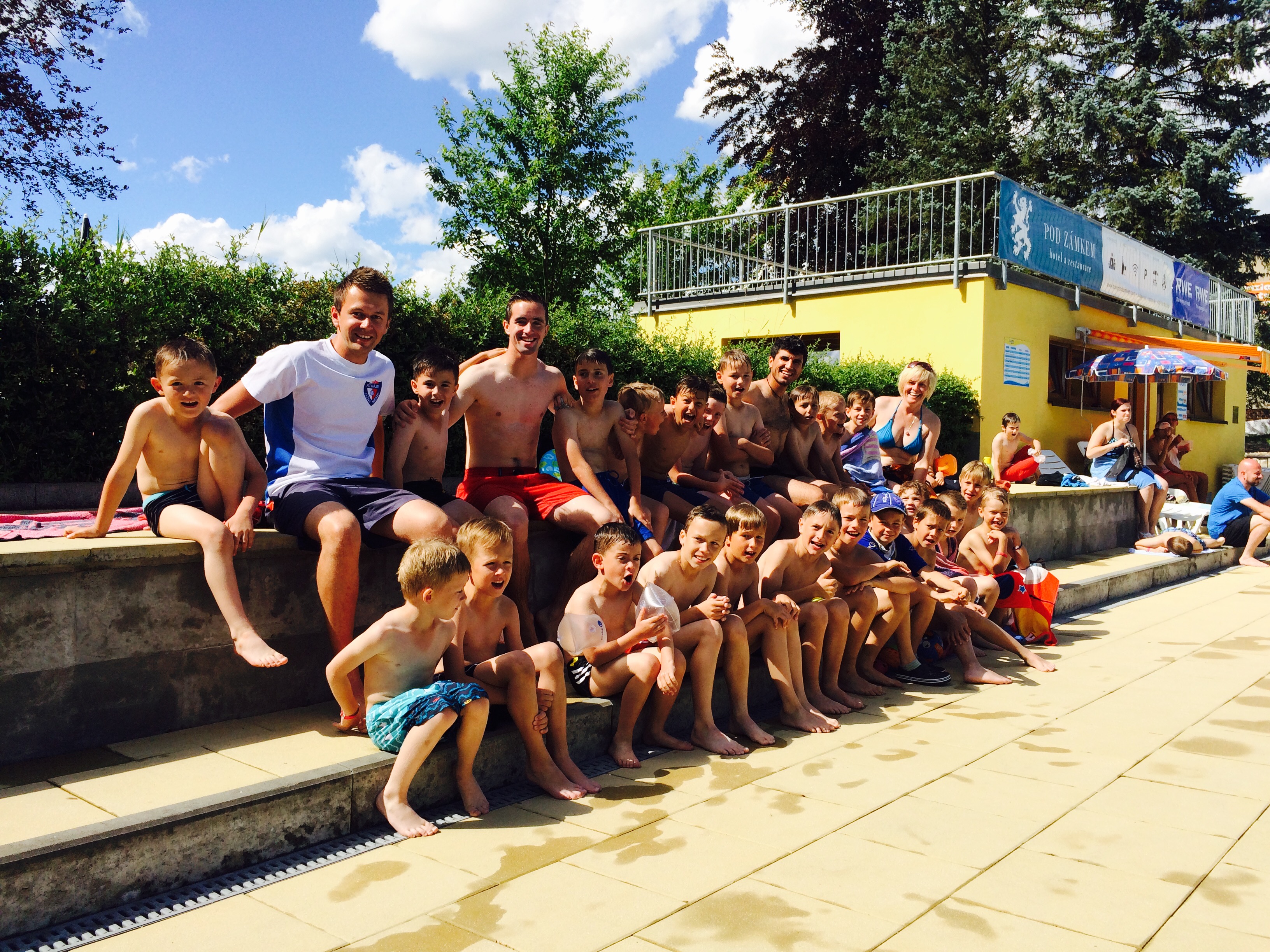 Druhým, neméně důležitým, alespoň pro kluky, byla návštěva místního koupaliště. Kluci se nemohli dočkat. Tam jsme zavítali po čtvrtém zápase a poté ještě jednou, neboť bylo zapotřebí hodit oslavence Víťu řádně do vody. Pauzu mezi zápasy jsme vyplnili různě, mimo i melounem, o který byl velký zájem všech zúčastněných.