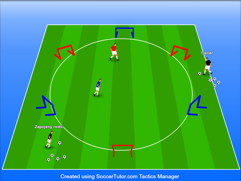 Jsou proti sobě dva týmy cca po čtyřech hráčích. V kruhu se hraje 1vs1. Červený hráč útočí na červené branky, modrý útočí na modré. Míče mají trenéři (pokud nejsou dva trenéři, může si trenér vypomoci rodičem) na obou stranách. Jeden z trenérů (či rodič) vhodí či kopne míč do kruhu a hráči hrají 1vs1 s tím, že se snaží zakončit do branky svého dresu. Následuje vhození dalšího míče (trenéři se mohou střídat, podívají se na sebe, kdo míč rozehraje). Hráči by měli kontrolovat oba dospělé, aby byli včas u míče. Tím přirozeně dochází ke zvednutí hlavy a orientace v kruhu 360 stupňů. Po třech či čtyřech soubojích dochází ke střídání hráčů. Takto můžeme hrát 10 – 15 minut, či změnit hru na 2vs2.