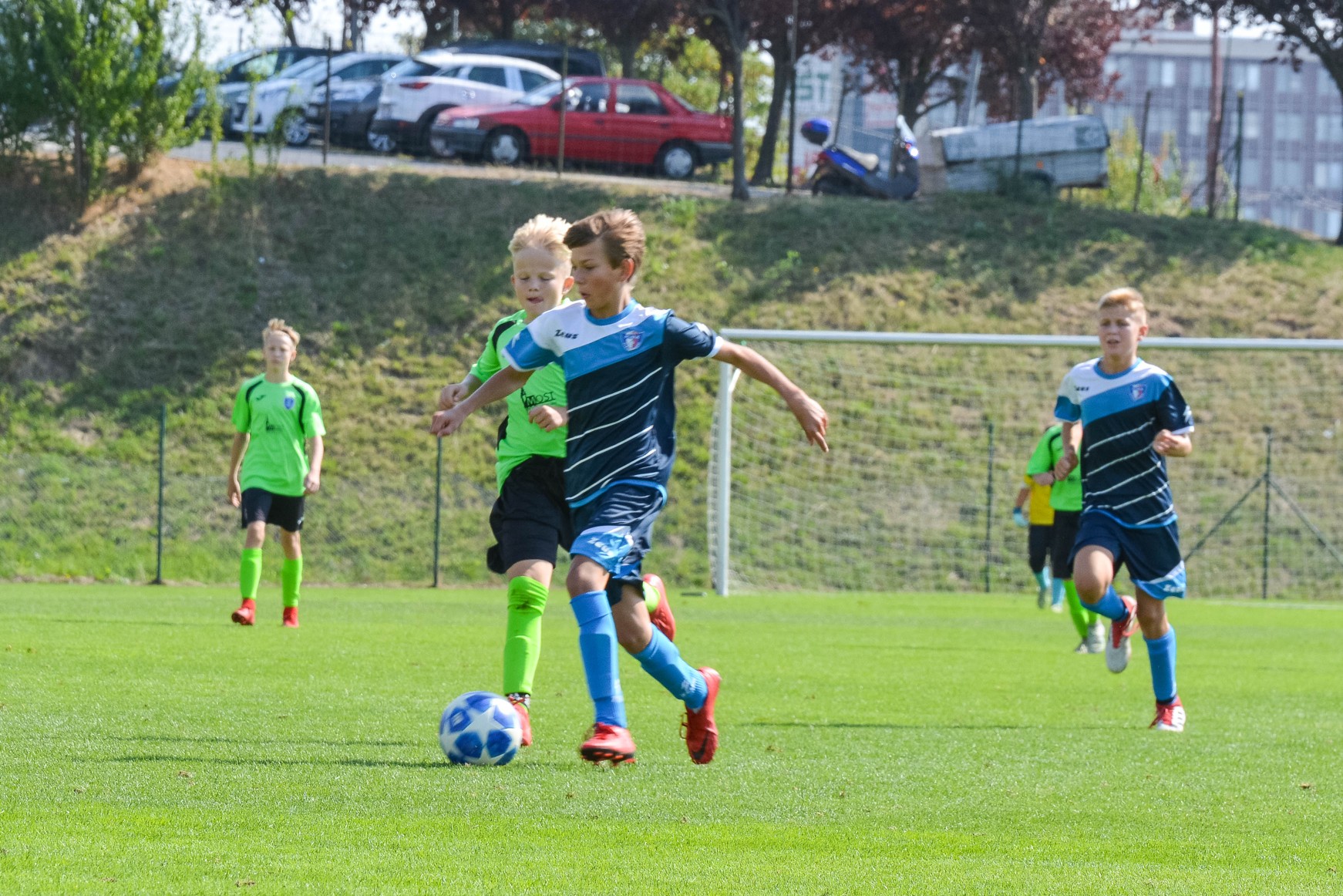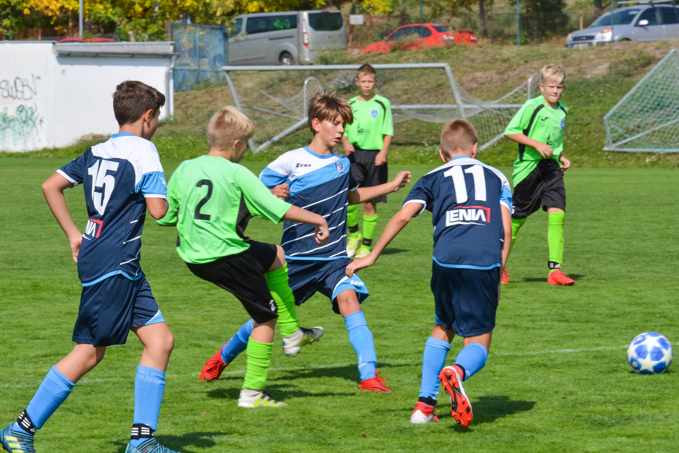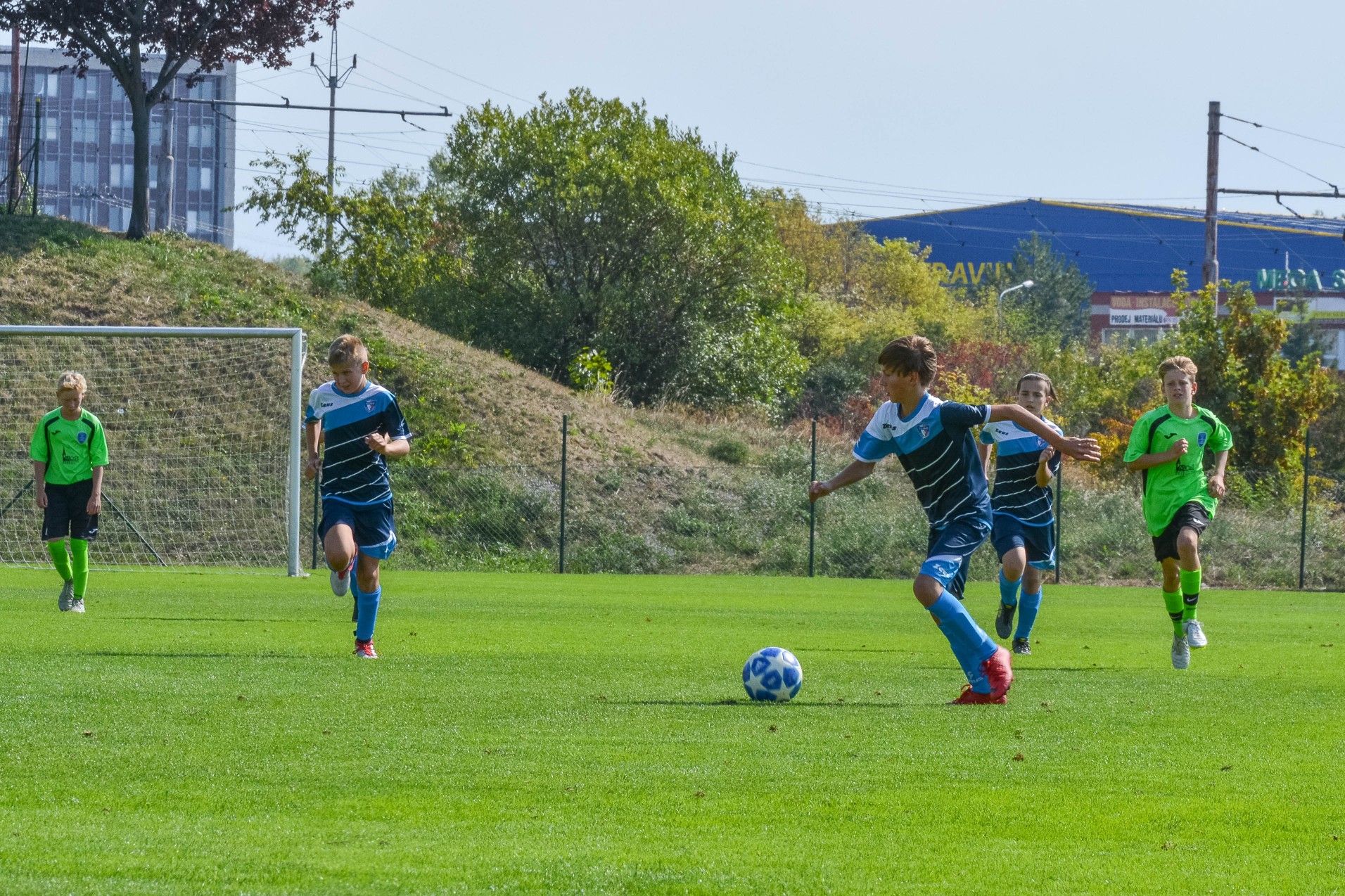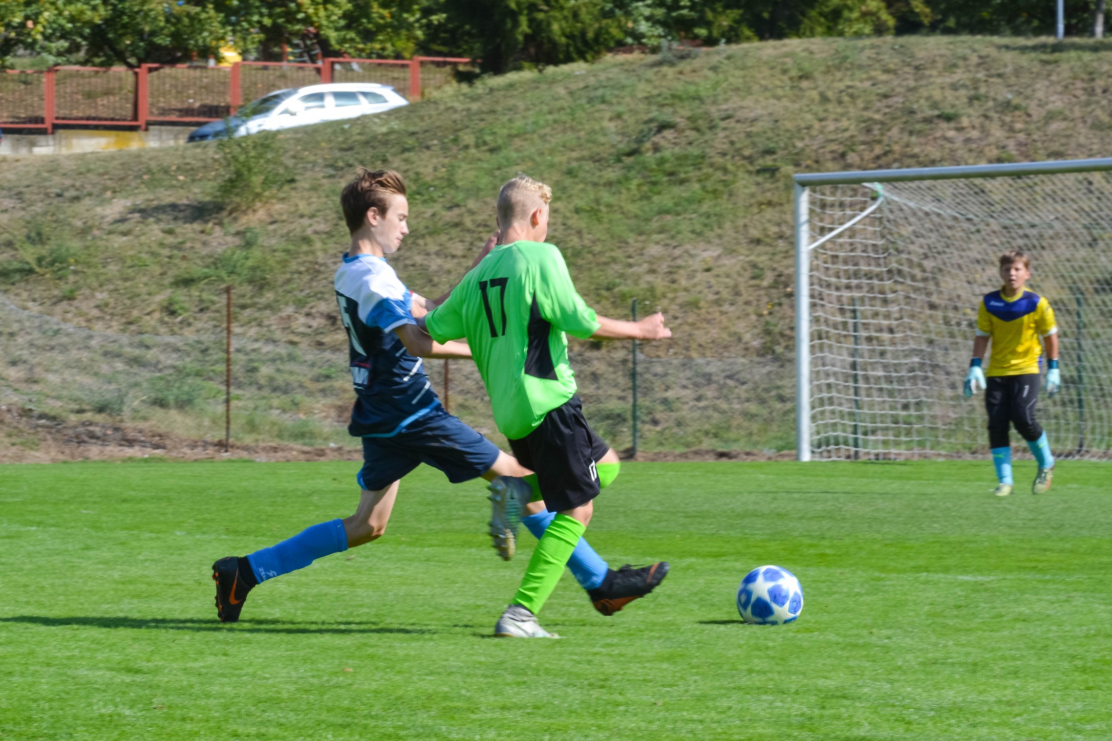 K zápasu jsme nastoupili v novém rozestavení a připraveni se poprat o první body ze soupeřova hřiště. I když zahřátí a namotivovaní, bohužel opět se nám nepodařilo chytnout začátek utkání a hned ve 3. minutě jsme inkasovali laciný gól, kdy na tento ročník nezvykle fyzicky vyspělý útočník soupeře č.9 nezastavil a důrazem před našim gólmanem získal míč a skóroval. Následně jsme hru srovnali, začali jsme kombinovat a po velmi hezké akci přes pravé křídlo a průnikovou přihrávku jsme zápas srovnali. Soupeř šel po dalších 6ti minutách znova do vedení po našem nedůrazu při rohovém kopu. V krátké době jsme ale odpověděli nádhernou ranou z cca 35 metrů, kterou náš útočník přeloboval brankáře. První poločas ještě zpestřila dvě rozhodnutí hlavního rozhodčího, kdy faul na našeho útočníka v malém vápně soupeře zůstal nepotrestaný a naopak nastřelená ruka našeho po souboji v malém vápně ležícího záložníka byla důvodem penalty. Měli jsme však štěstí, protože soupeř pokutový kop neproměnil.