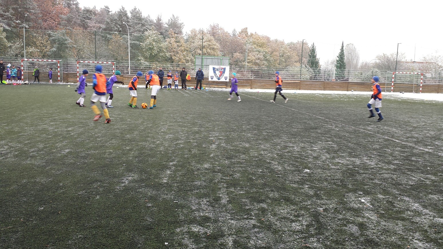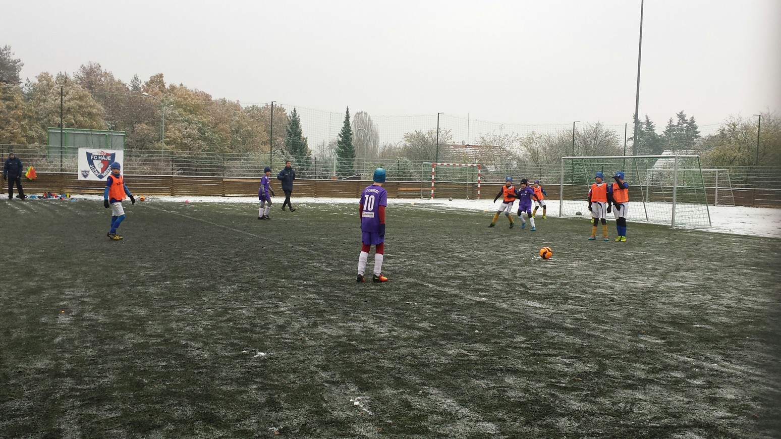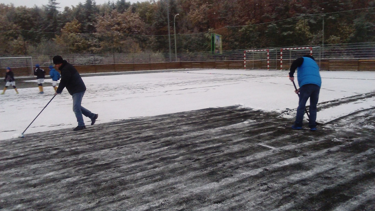 Nejdříve bych chtěl moc poděkovat našim tatínkům, kteří nám společně pomohli s úklidem sněhu z hrací plochy. Podmínky pro fotbal nebyly ideální, ale zase jsme si vyzkoušeli hrát na těžším terénu.